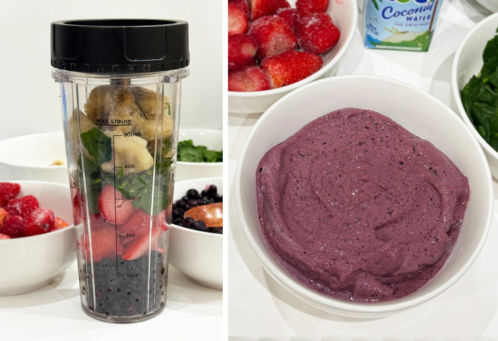 Some blenders may struggle with frozen fruit. You might have to cut things smaller or add extra liquid. Thankfully, my Ninja blender handles frozen fruit like a champ, and can make everything from thick, spoonable smoothie bowls, to blended coffee drinks.
